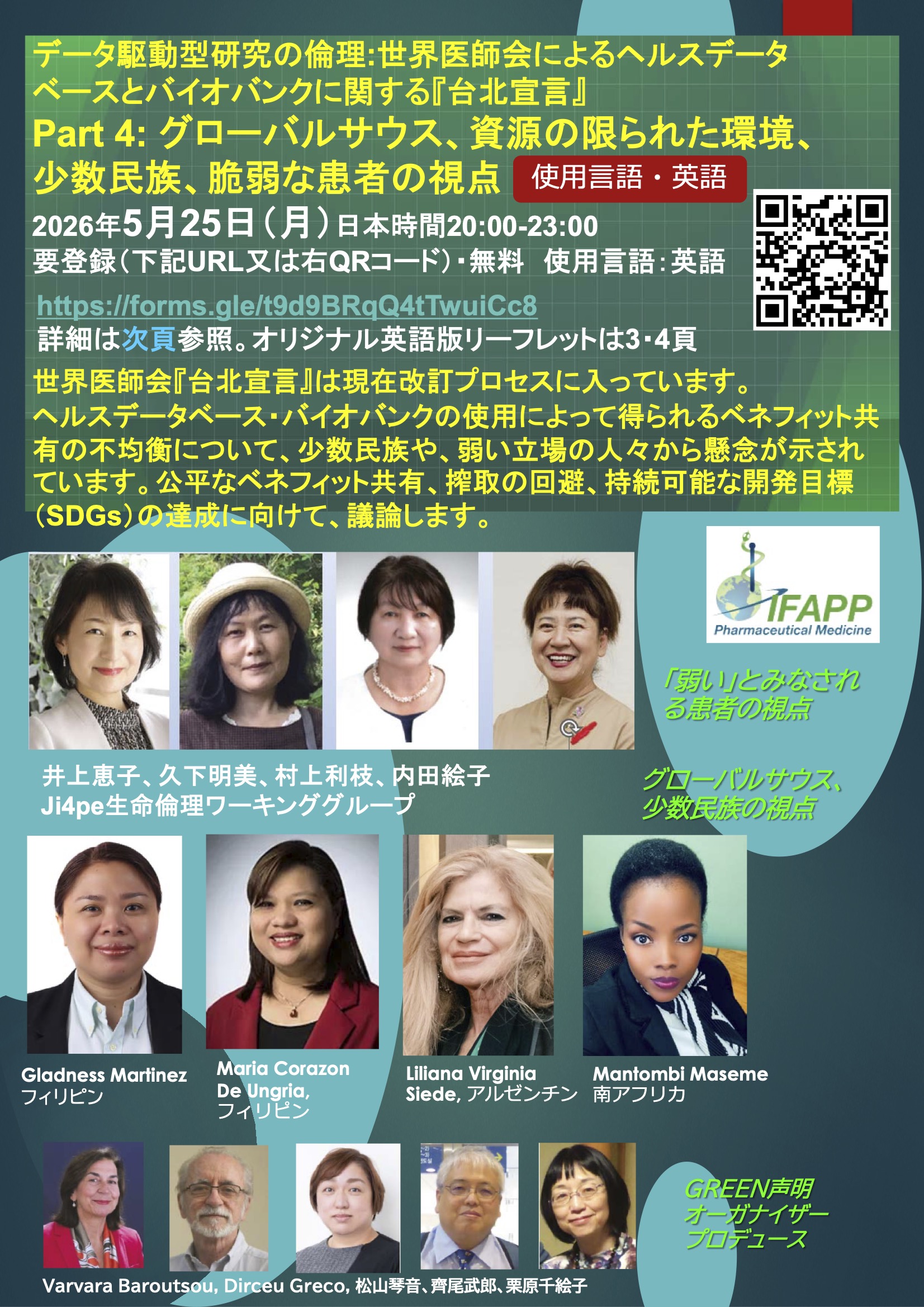 テーマ:「データ駆動型研究の倫理:世界医師会によるヘルスデータベースとバイオバンクに関する『台北宣言』 Part 4: グローバルサウス、資源の限られた環境、少数民族、脆弱な患者の視点」