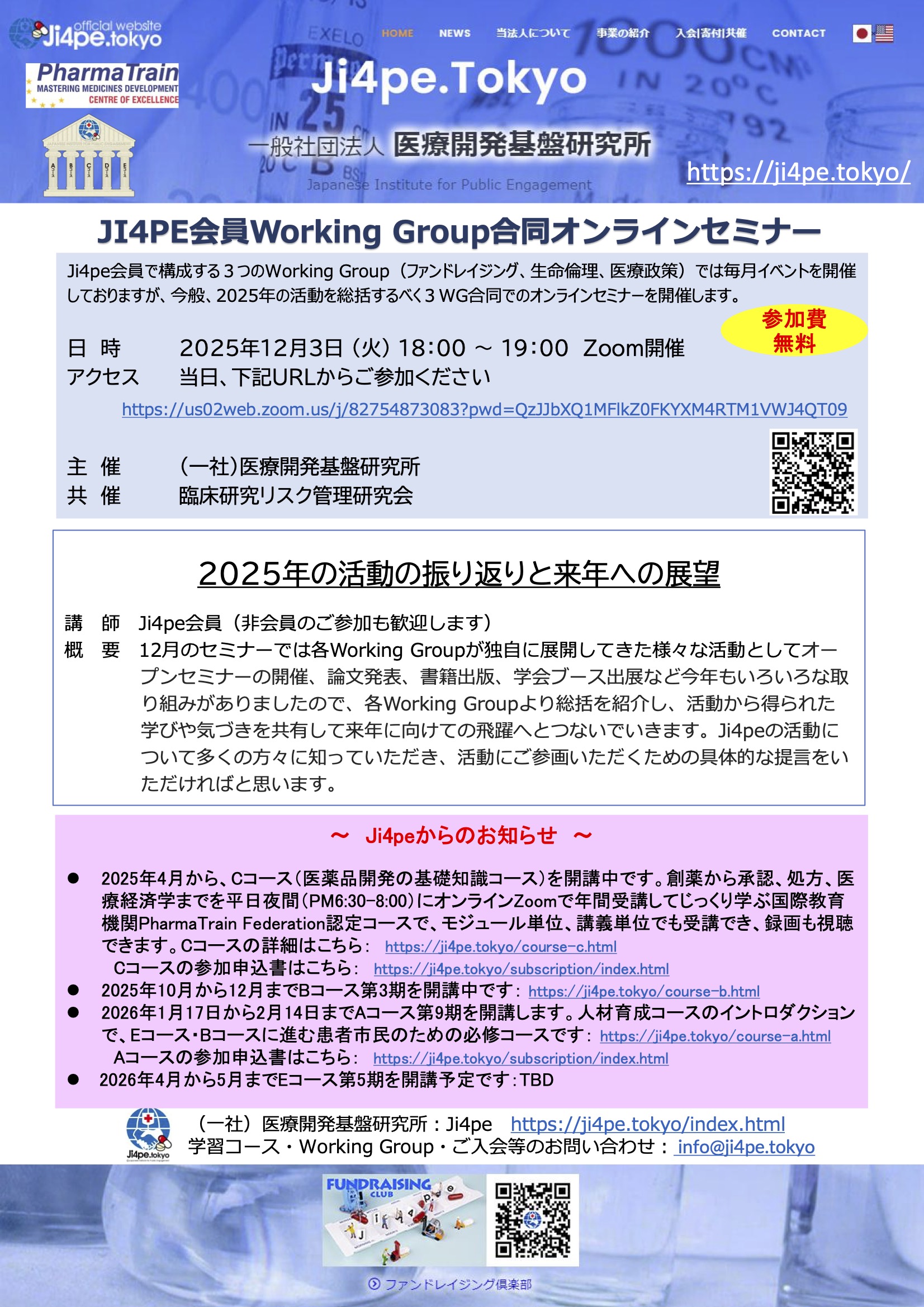 Ji4peでは学習コースと会員Working Group主催セミナーへの参加費について、下記のとおり適用することになりました。 ・学習コース:主に患者・市民を対象とするAコース・Bコース・Eコースの3コースについては、2025年4月以降に開講するコースへの参加費を無料とするキャンペーンを開始します。