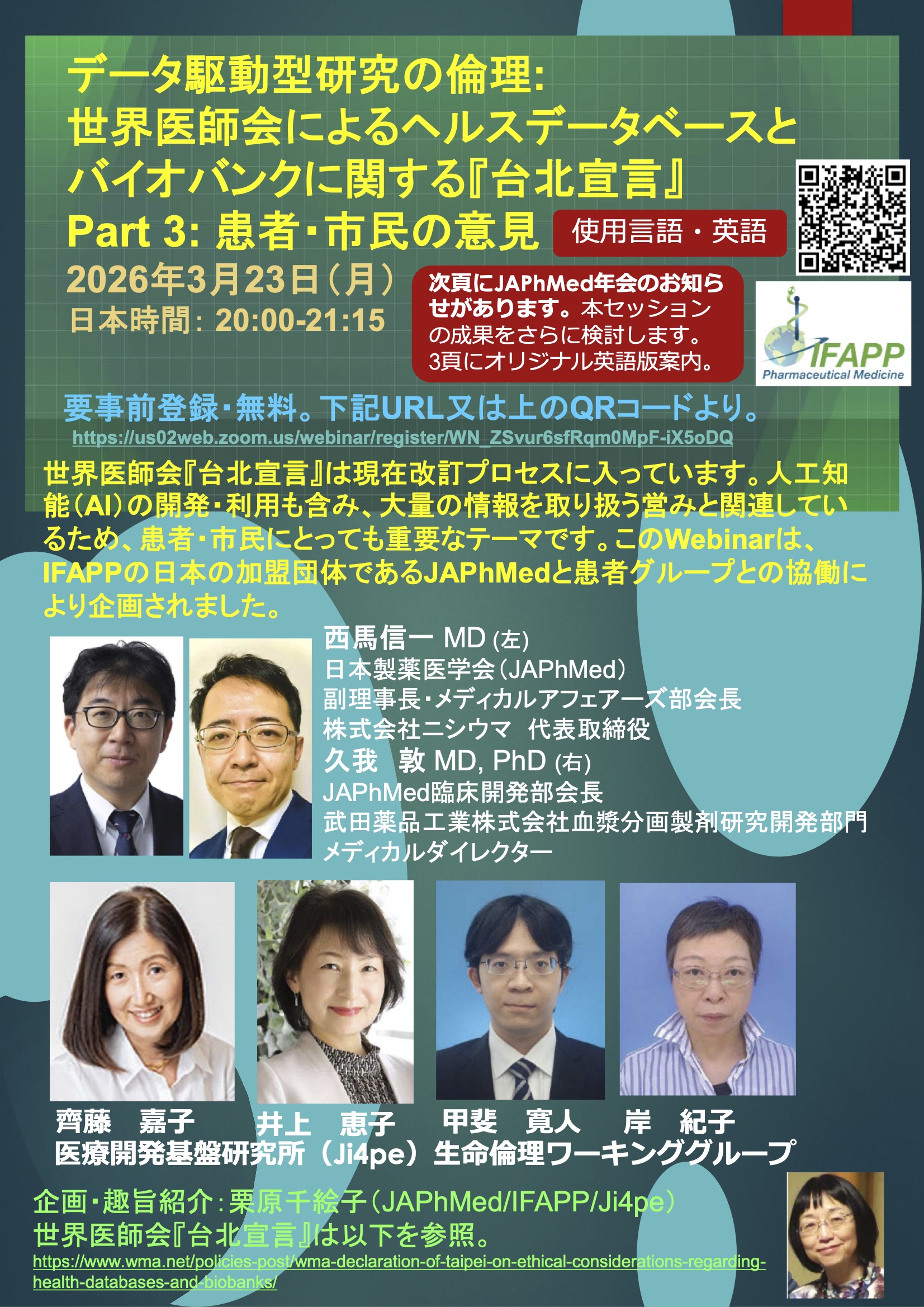 概 要:Ji4pe生命倫理ワーキンググループのメンバーが、世界医師会のヘルスデータベースとバイオバンクに関する「台北宣言」に対する意見をまとめて、IFAPPのウェビナーで発表します。日常診療のリアルワールドデータを使う研究や人工知能(AI)の開発など、多くの患者・市民に関わる倫理的問題に対する意見を参加者の皆さんと議論し、世界に発信したいと思いますので、ぜひ参加ください。