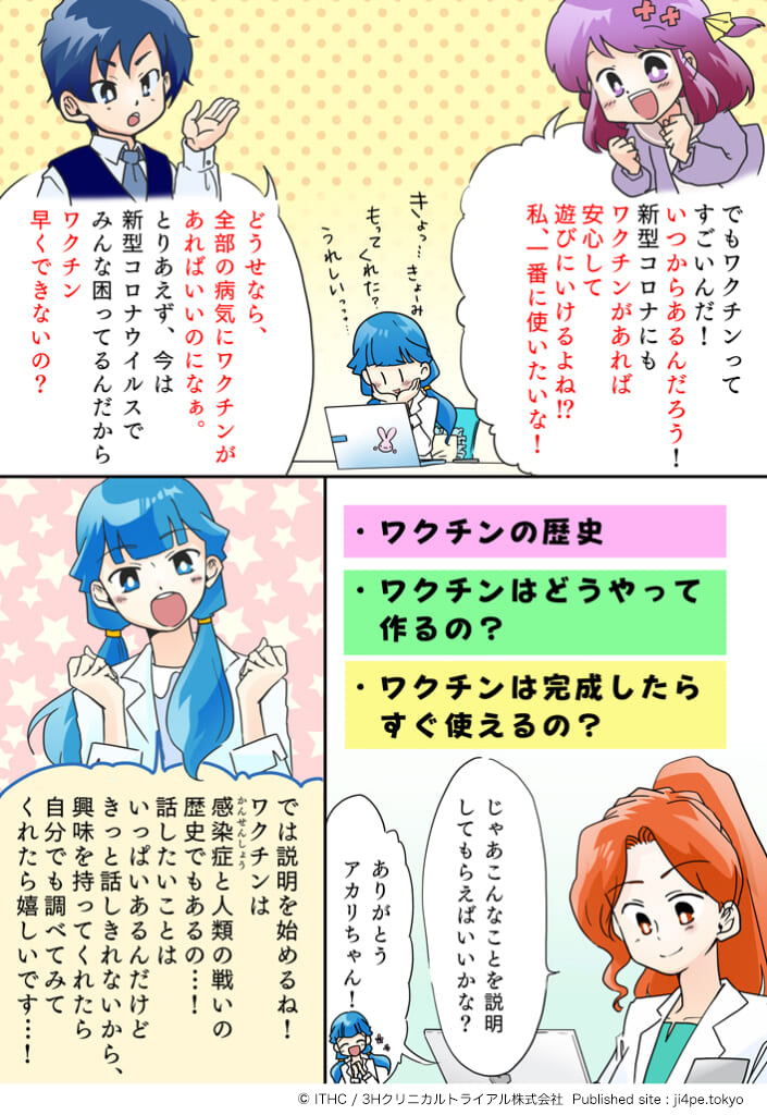 この、天然痘ワクチンの研究では、実際に子供にワクチンを使って効果を確かめたという話があり、みんなと同じくらいの子供も協力して完成しました。当時の研究者、協力者がみんなでつかんだ勝利です。