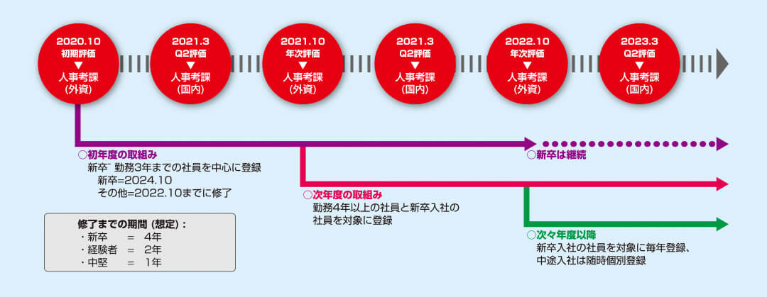 下記の図は企業での人事評価時期に合わせた一例で、参加企業の年間スケジュールに連動することでSMDプログラムでの評価結果を人事評価に取り入れることができます。年度の開始月は相談に応じます。